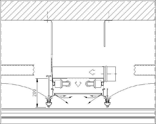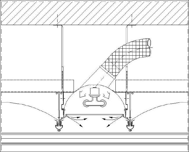 In the PAGULA-system supply air, suitable conditioned, is ducted directly through the ceiling plenum to adjustable supply air grilles mounted along the edges of the PAGULA-ceiling. The grilles may be adjusted to utilise the coanda effect to send the supply air down the adjacent wall to floor level or to produce positive air movement in adjacent work areas. |